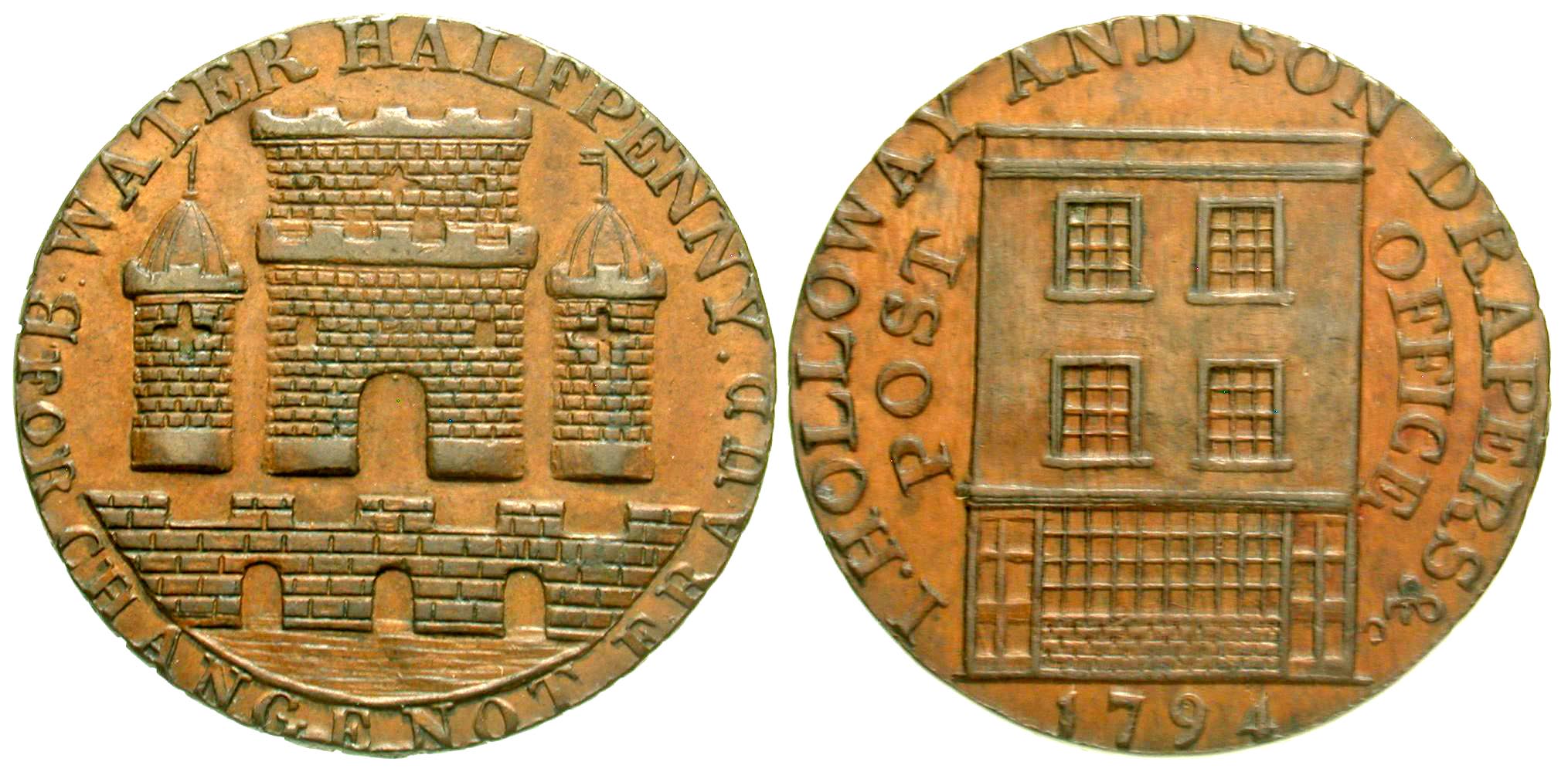 Great Britain, Somerset. Bridgewater. 1794. AE penny. I.HOLLOWAY AND SON DRAPERS &C POST OFFICE / 1794, front view of a Georgian building and shopfront, legend around, date in exergue / B.WATER HALFPENNY. FOR CHANGE NOT FRAUD / Edge: ON DEMAND WE PROMISE TO PAY, part of a castle and a bridge. D&H 86. EF.