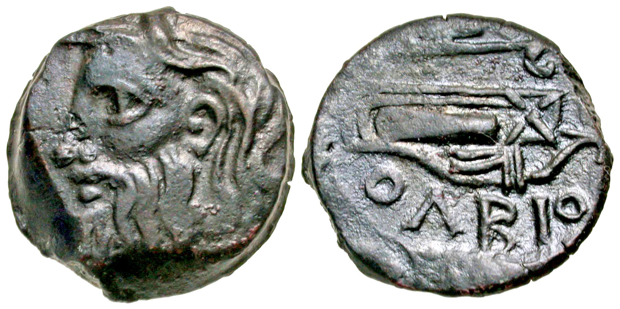 Skythia, Olbia. civic issue. 260-250 B.C. AE 22 (22 mm, 9.69 g, 9 h). Bearded head of river-god Borysthenes left / OΛBIO, ethnic beneath uncertain monogram, batttle axe, and bow with bow case . Anokhin 295-386; SNG BM Black Sea 451-533; Cf. Hgc-3.2, 1887. aEF, flan a bit irregular as usual, nice for type, glossy black patina.
