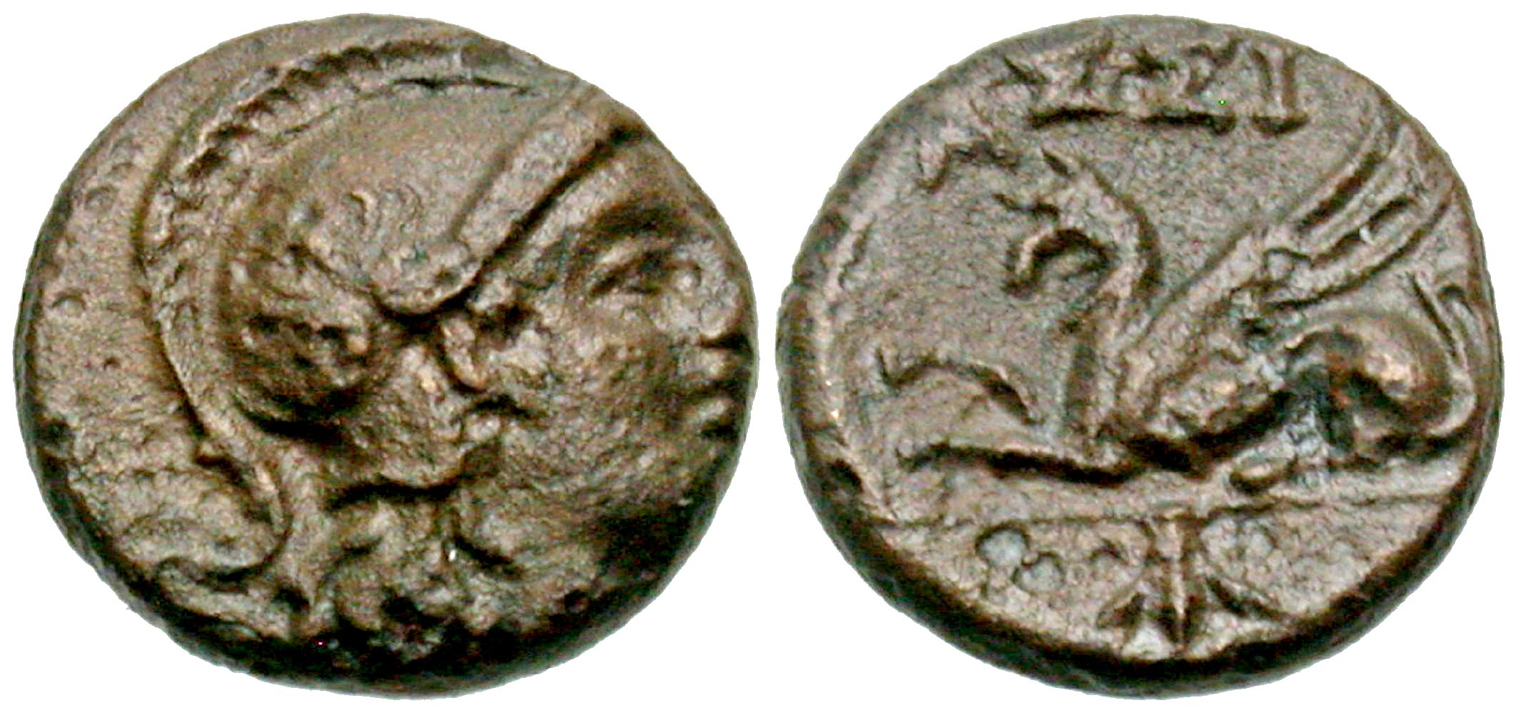 Troas, Assos. 4th-3rd Century B.C AE 9 (9.3 mm, .83 g). Head of Athena right, wearing Attic helmet / AΣΣI, griffin reclining left, bee in exergue. SNG von Aulock 7583. Near VF, Red-brown patina, slight porosity. Rare variety with bee symbol, none in CoinArchives.