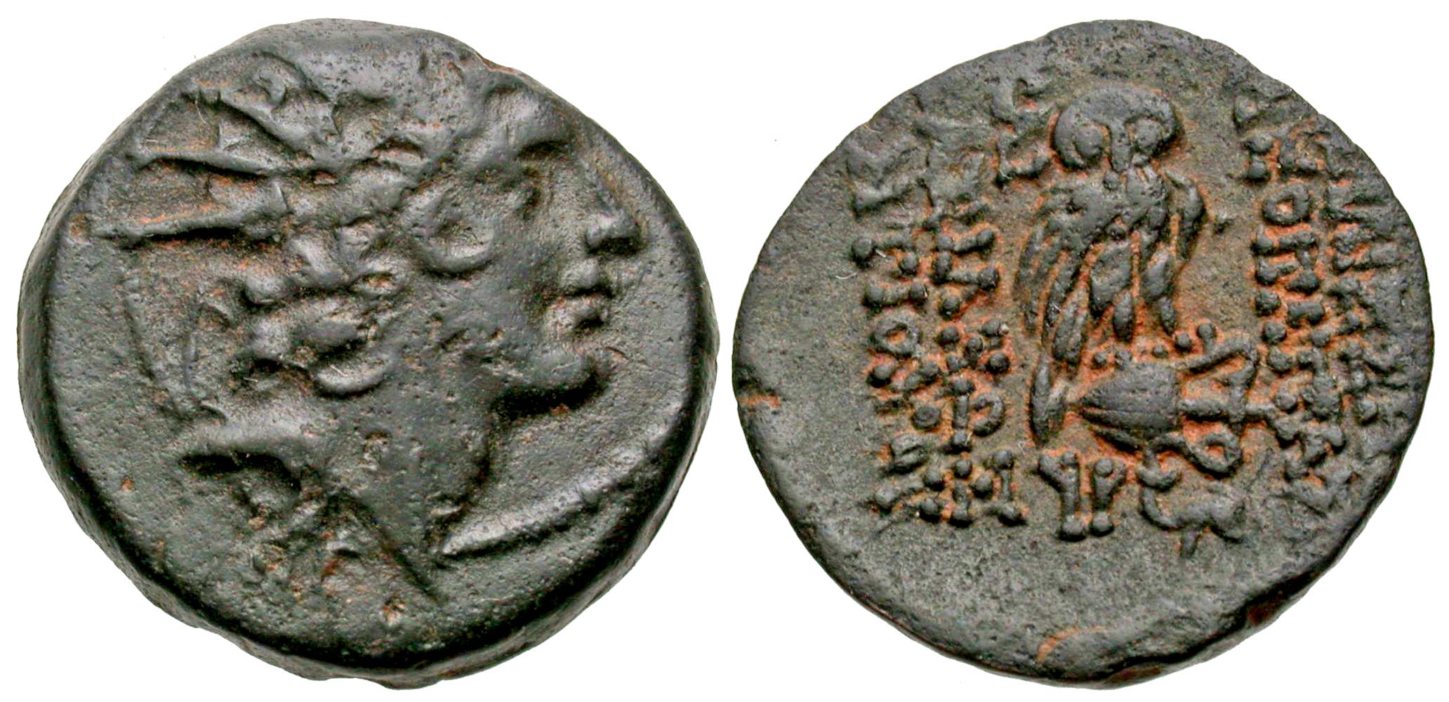 Seleukid Kingdom. Cleopatra Thea and Antiochos VIII Epiphanes. 125-121 B.C. AE 20. Antioch on the Orontes mint. Radiate and diademed head of Antiochos VIII right / ΒΑΣΙΛΙΣΣΗΣ ΚΛΕΟΠΑΤΠΑΣ KAI ΒΑΣΙΛΕΩΣ ΑΝΤΙΟΧΟΥ, owl standing on amphora, thunderbolt below. SC 2263; SNG Spaer 2447. VF/gVF.
