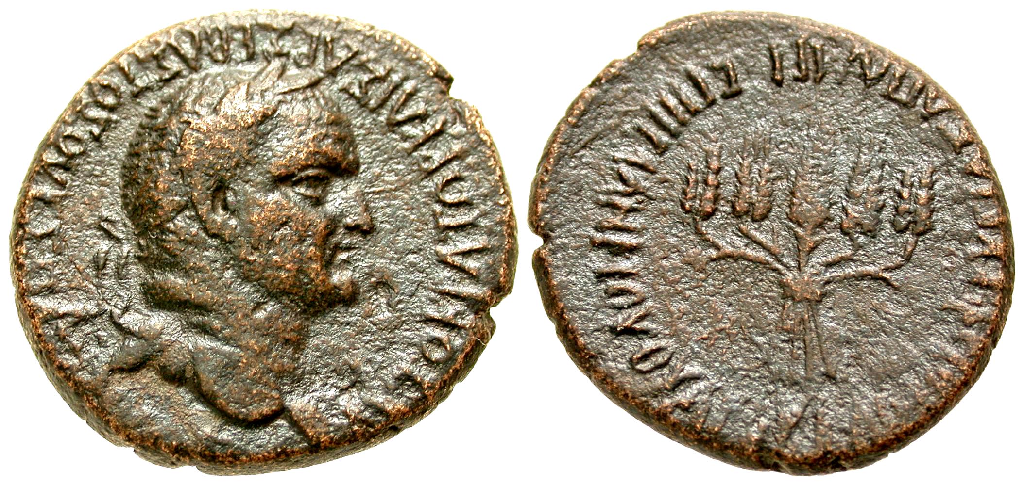 Bithynia, Uncertain Mint. Vespasian. A.D. 69-79. AE 25 (25.3 mm, 9.47 g, 12 h). Marcus Plancius Varus, proconsul. ΑΥΤΟΚΡΑΤΩΡ ΚΑΙΣΑΡ ΣΕΒΑΣΤΟΣ ΟΥΕΣΠΑΣΙΑΝΟΣ, laureate head of Vespasian right / ΕΠΙ ΜΑΡΚΟΥ ΠΛΑΝΚΙΟΥ ΟΥΑΡΟΥ ΑΝΘΥΠΑΤΟΥ, bundle of five ears of grain. Rec Gen 4 var. (six ears of grain); Stumpf 337 ('Claudiopolis'). VF. Very rare.