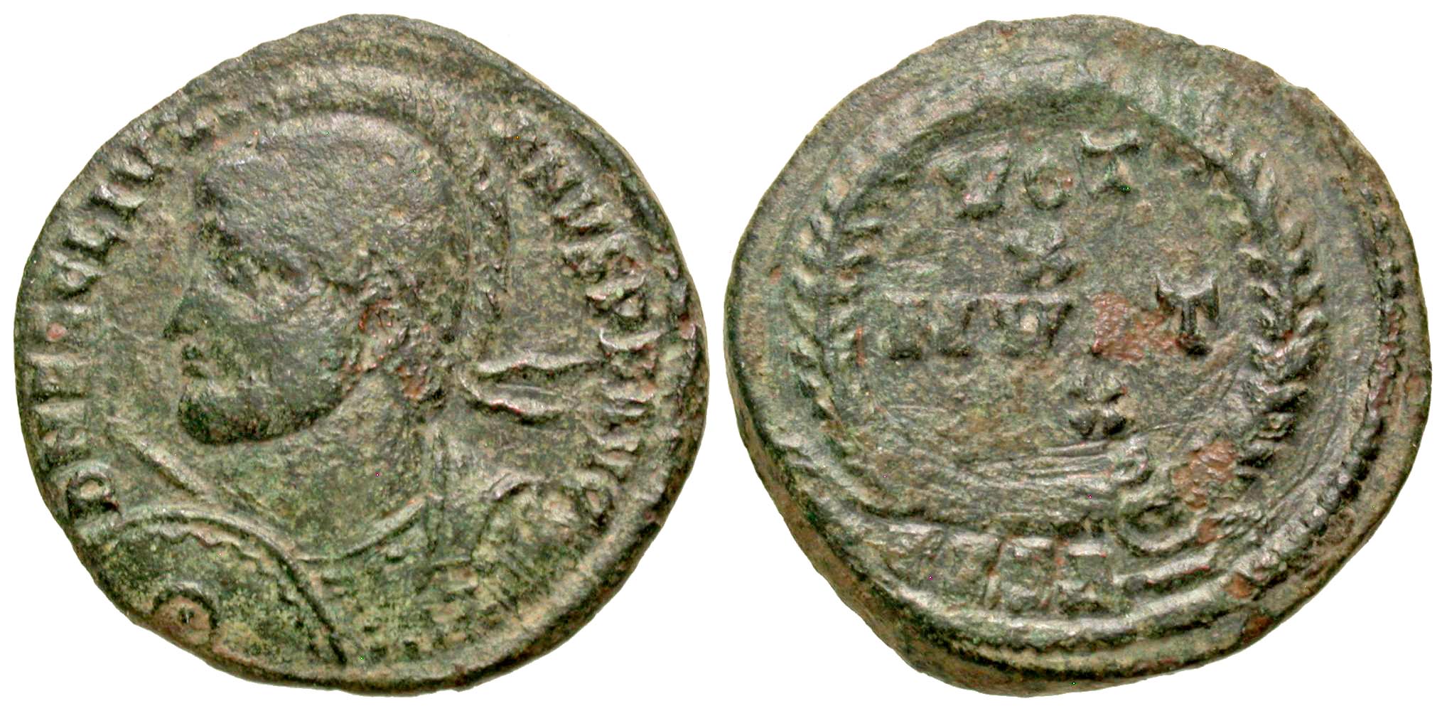 Julian II. A.D. 360-363. Æ20 - centenionalis (19.5 mm, 3.01 g, 5 h). Sirmium mint, Struck A.D. 362-363. D N FL CL IVLI-ANVS P F AVG, helmeted and cuirassed bust of Julian II left holding spear and shield / VOT / X / MVLT / XX, Vota dedication in four lines within laurel wreath; // SIRM. RIC VIII 108; LRBC1697; SRCV 19172. Near VF, well-struck and centered except for two letters in Vota dedication which are missing, presumably, due to plugged die; thick olive patina.