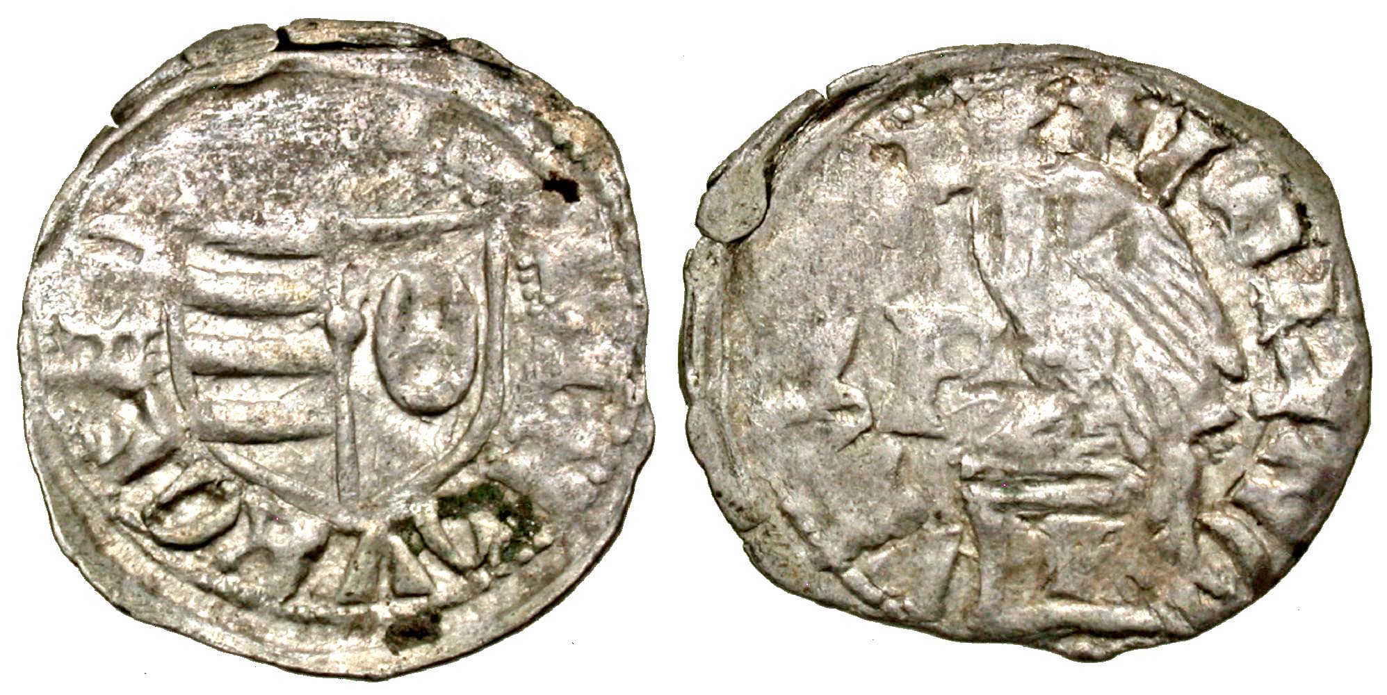 Wallachia. Dan I, with Mircea the Elder. 1383-1386. AR ducat (15.5 mm, .33 g). Shield / Eagle standing atop rocks; P in left field. MBR 89.