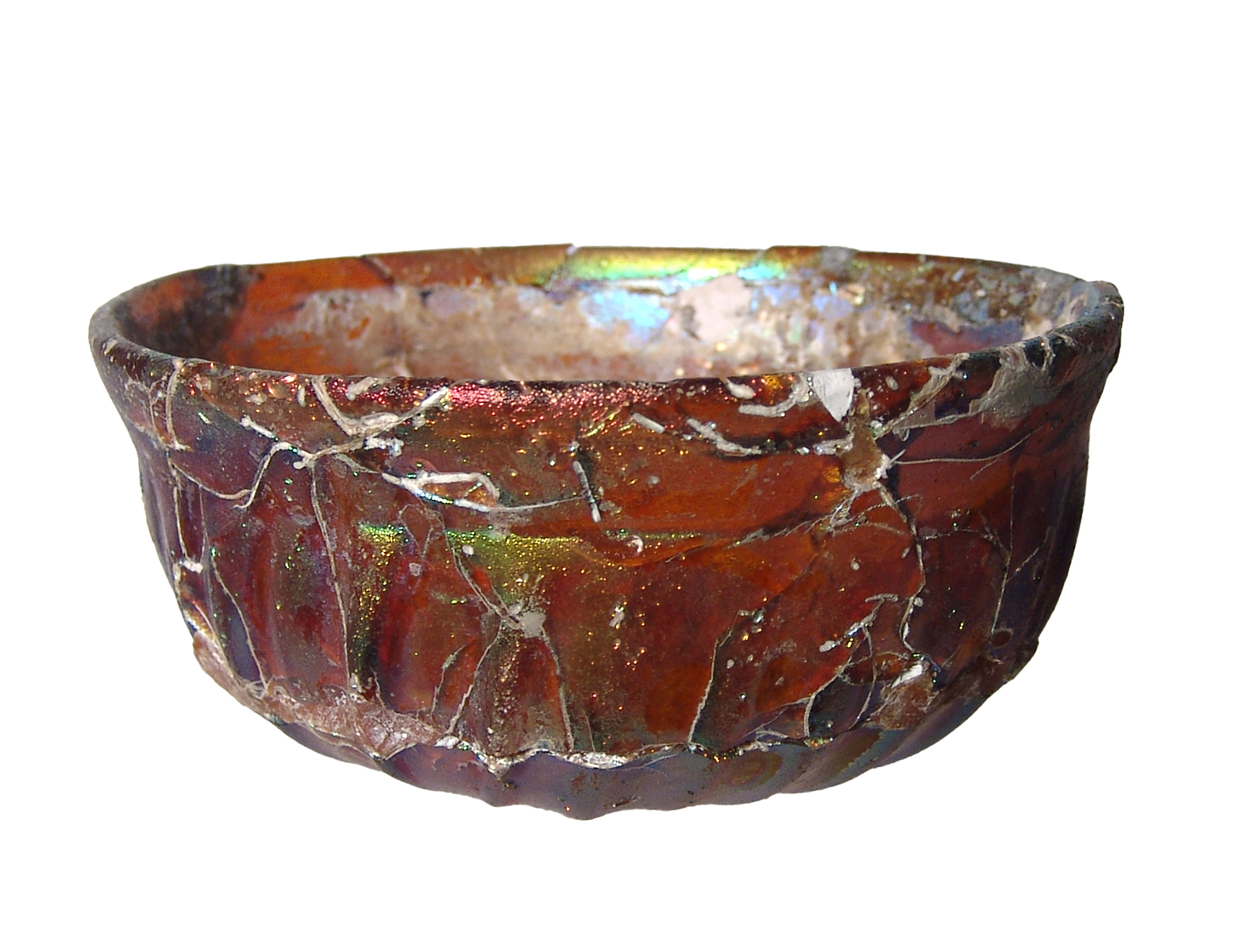 An attractive, amber-colored ribbed bowl, Roman, Late 1st Century B.C.-1st Century A.D. , the base indented, and rim lightly flared. H: 2 1/8? (5.4 cm); Dia: 4 7/8? (12.4 cm). Some repair and restoration, the outside with gorgeous yellow-green iridescence. Cf. Hermitage, p. 257, no. 54; Ex English private collection.Estimated Retail Value: $1,250-1,800.