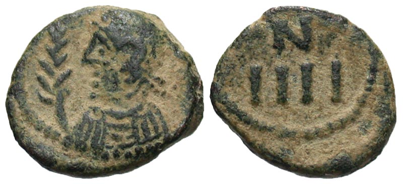Vandals, Carthage. Municipal Coinage. ca. 480-533. Æ nummus (12.1 mm, 1.34 g, 12 h). Rare. anepigraphic, laureate, draped and cuirassed bust left, palm in left field / N/IIII in two lines across fields; – above N. BMC 12 (Huneric); MIB 20 (Gelimer); MEC 55. EF, sandy patina.