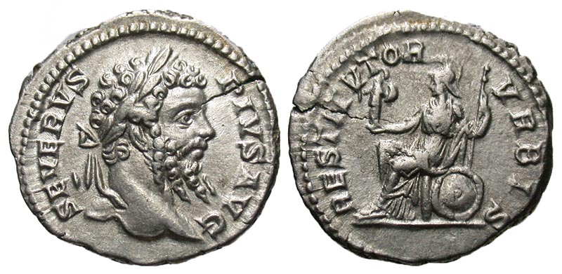 Septimius Severus. A.D. 193-211. AR denarius (19.4 mm, 3.52 g, 1 h). Rome mint, A.D. 201. SEVERVS PIVS AVG, laureate head right / RESTITVTOR VRBIS, Roma seated left on shield, holding Palladium and scepter. RIC 288; BMCRE 359; RSC 606. near EF, flan crack.