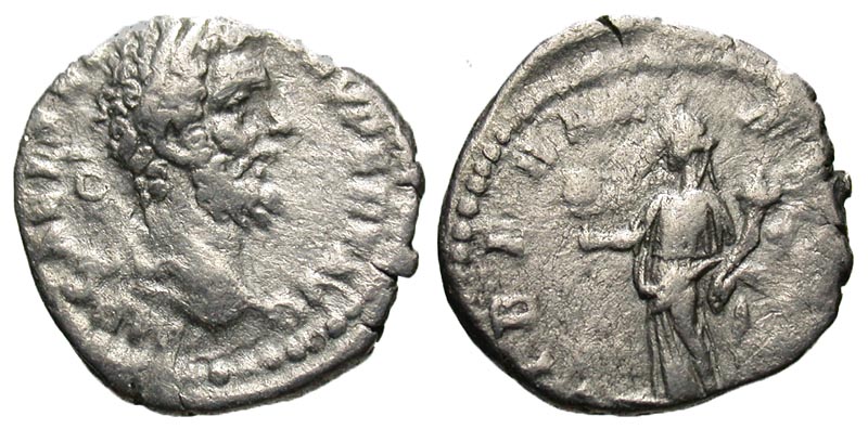 Septimius Severus. A.D. 193-211. AR denarius (18.2 mm, 2.81 g, 5 h). Rome mint, A.D. 193. IMP CAE L SEP SEV PERT AVG, laureate head right / LIBERAL AVG COS, Liberalitas standing left, holding tessera and cornucopia. RIC 18; BMCRE 2; RSC 281. Fine.