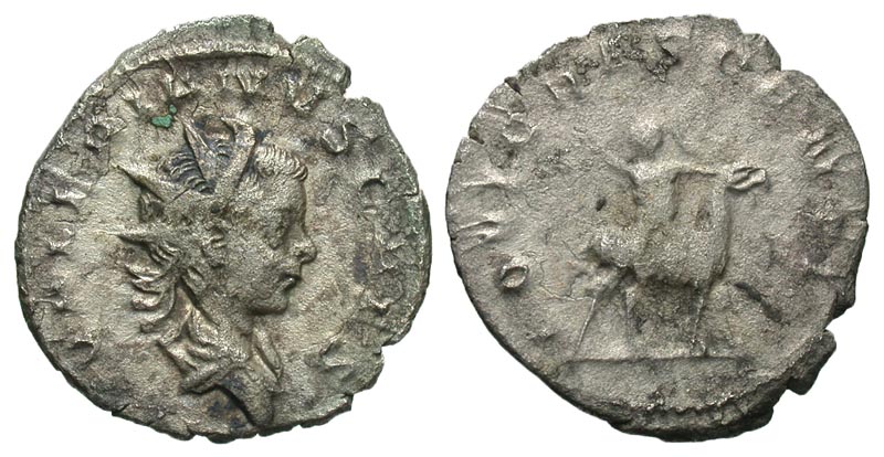 Valerian II. Caesar, A.D. 253-255. BI antoninianus (22.2 mm, 2.81 g, 7 h). Cologne mint, A.D. 257-258. Scarce. VALERIANVS CAES, radiate and draped bust right / IOVI CRESCENTI, young Jupiter riding goat Amalthea right, head left, raising hands. RIC 3; RSC 26. aFine, toned.