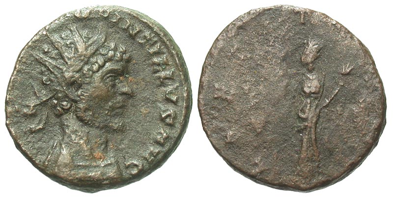 Quintillus. A.D. 270. Æ antoninianus (17.7 mm, 3.60 g, 1 h). Rome mint. IMP C M AVR C L QVINTILLVS AVG, radiate, draped and cuirassed bust right / LAETITIA AVG, Laetitia standing left, holding wreath and cornucopia. RIC 64. Fine, reverse, weak die strike.