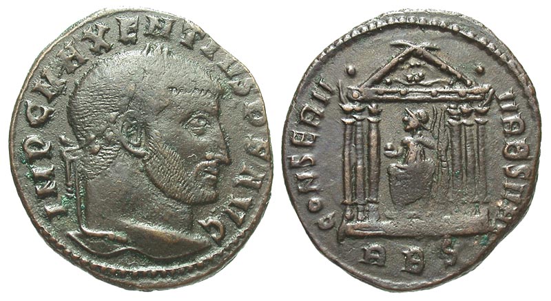 Maxentius. A.D. 306-312. Æ Follis (26.0 mm, 6.37 g, 6 h). Rome mint, A.D. 308-310. IMP C MAXENTIVS P F AVG, laureate head right / CONSERV VRBS VAE, Roma seated facing, head left, in hexastyle temple, globe in her right hand, scepter in left; RBS in exergue. RIC 210. VF.