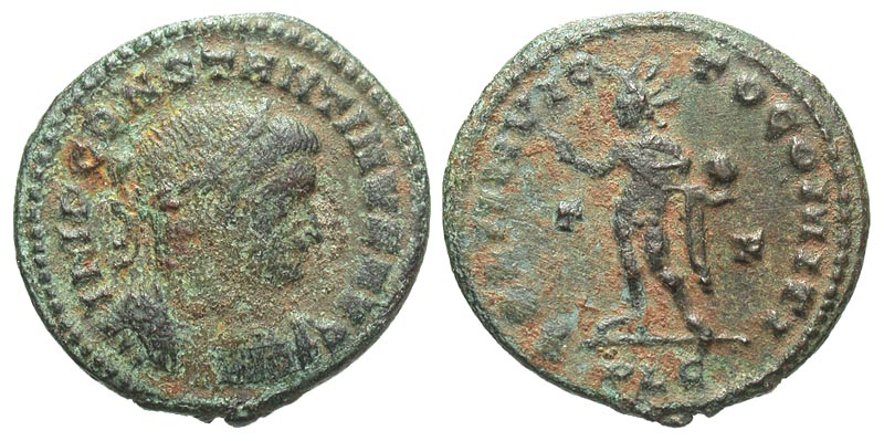 Constantine I. A.D. 307/10-337. Æ Follis (20.8 mm, 3.83 g, 1 h). Lugdunum mint, A.D. 315-316. IMP CONSTANTINVS AVG, laureate, draped and cuirassed bust right / SOLI INVICTO COMITI, Sol standing left, holding globe and raising right hand; T-F across fields, PLG in exergue. RIC 34. aVF, green and red patina.
