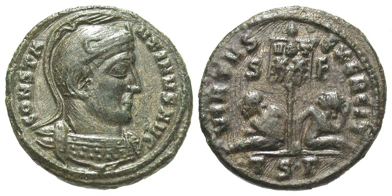 Constantine I. A.D. 307/10-337. Æ 3 (19.3 mm, 3.36 g, 6 h). Thessalonica mint, A.D. 320. CONSTANTINVS AVG, helmeted and cuirassed bust right / VIRTVS EXERCIT, two captives seated between banner with VOT/XX; S-F, ·TS·Γ· in exergue. RIC 75. gVF.