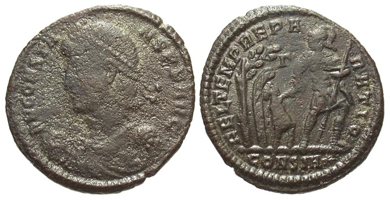 Constans. A.D. 337-350. Æ centenionalis (21.3 mm, 3.89 g, 11 h). Constantinople mint, A.D. 348-351. DN CONSTANS PF AVG, diademed, draped, and cuirassed bust left, holding globe / FEL TEMP REPARATIO, soldier advancing right, holding spear and looking back, leading small figure from a hut beneath a tree; Γ/CONSIA* in exergue. RIC 92; LRBC 2017. F/VF.