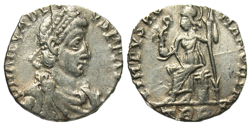 Arcadius. A.D. 383-408. AR siliqua (14.9 mm, 1.09 g, 11 h). Trier mint, A.D. 392-395. DN ARCADIVS PF AVG, pearl-diademed, draped, and cuirassed bust right / VIRTVS ROMANORVM, Roma seated left, holding Victory on a globe and spear; TRPS in exe. RIC 106b; LRBC 27e. VF, clipped. Ex Gussage All Saints Dorset hoard. Spink 12026, lot 460, part 1 of 10.