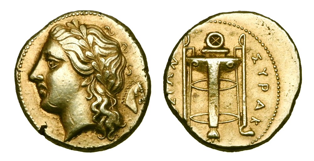 SICILY, Syracuse. Agathokles, 317-289 BC. Electrum 50 Litrae (3.52 gm). Laureate head of Apollo, horse head behind / Tripod. SNG.ANS.631. VF+. Choice and Scarce. Interesting symbol.