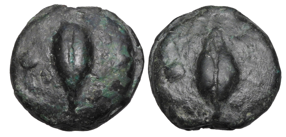 ROMAN REPUBLIC. 275-270 BC. AEs Grave Uncia (30.98 gm). Barley-grain / Barley-grain. TV.13. Cr.18/6. VF, green patina.