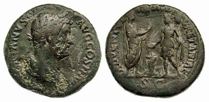 HADRIAN, 117-138 AD. AE Travel Series Sestertius (29.30 gm). Laureate bust / Emperor standing sacrificing over altar, greated by Mauretania standing. RIC.897(R). aVF, brown black patina, patchy porosity and smoothing. Rare. Part of Hadrian�s Travel Series.