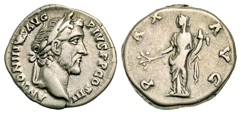 ANTONINUS PIUS, 138-161 AD. AR Denarius (3.33 gm). Laureate head / Pax standing with branch and cornucopia. RIC.78c. VF.
