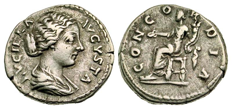 LUCILLA, wife of Verus, 161-169 AD. AR Denarius (3.21 gm). Draped bust / Concordia seated with patera and cornucopia. RSC.7. RIC.759. Toned VF.