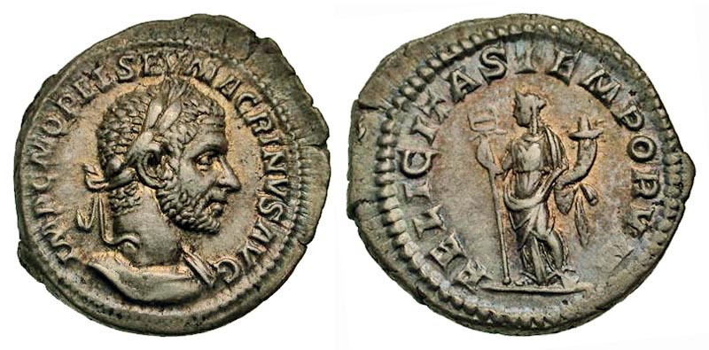 MACRINUS, 217-218 AD. AR Denarius (3.03 gm) of Rome. Laureate cuirassed bust / Felicitas holding caduceus and cornucopiae. RIC.59. RSC.15. Toned VF+.