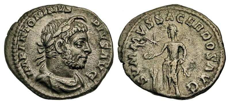 ELAGABALUS, 218-222 AD. AR Denarius (2.36 gm). Laureate horned draped and cuirassed bust / Emperor sacrificing over tripod and holding branch, star in field. RSC.276. RIC.146. Toned VF+.