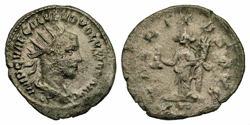 VOLUSIAN 251-253 AD. AR Antoninianus (2.90 gm). Radiate draped cuirassed bust / Uberitas standing holding purse and cornucopia. RIC.237b(R). Toned VF. Rare