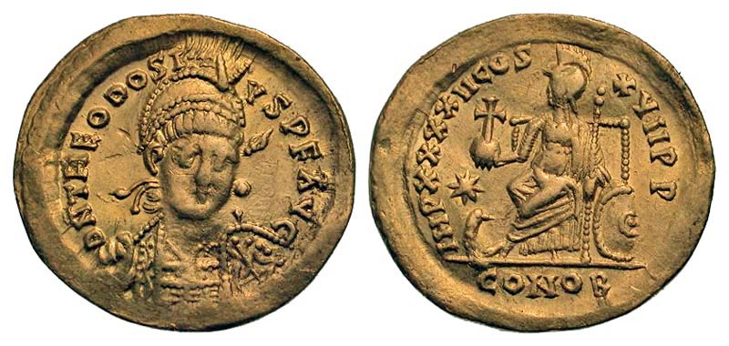 THEODOSIUS II, 402-450 AD. Gold Solidus (4.36 gm) of Constantinople, 430-440 AD. Helmeted diademed bust 3/4 facing right / Constantinopolis enthroned. RIC.323. aXF. ex Arpasi collection.