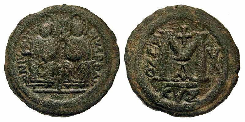 BYZANTINE EMPIRE. Justin II, 565-578 AD. AE Follis (10.25 gm) of Kyzikos, yr. 10, off. A. Justin & Sophia enthroned / Large M. S.372. aVF, green patina. Scarce.