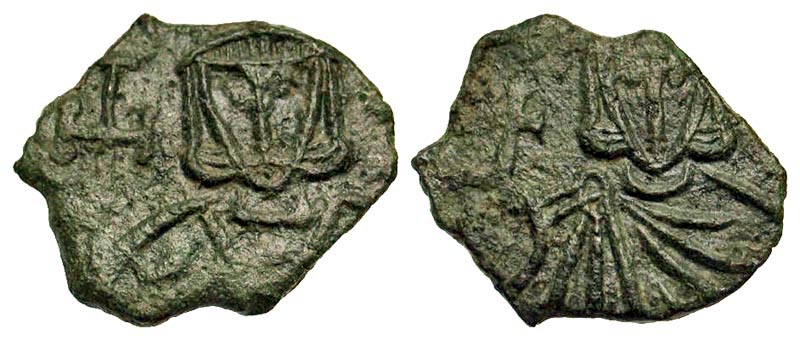 BYZANTINE EMPIRE. Leo V, the Armenian, 813-820 AD. AE Follis (1.64 gm) of Syracuse. Crowned facing bust of Leo / Crowned facing bust of Constantine. S.1638. VF+, green patina, ragged flan.