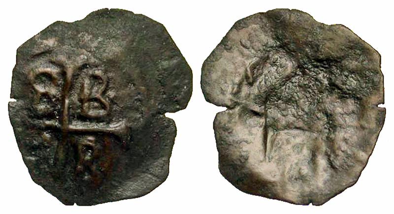 BYZANTINE EMPIRE. Andronikos II & Michael IX, 1295-1320 AD. AE Assarion (0.89 gm) of Constantinople. Brockage of rev / Four B�s in angles of cross. S.2448. VF, green brown patina. Scarce.