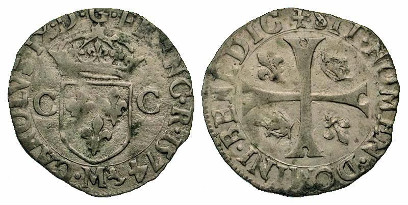 FRANCE, Valois. Charles IX, 1560-1574 AD. AR Douzain (2.19 gm) of Toulouse, 1574 M. Crowned arms / Croix �chancr�e. DuP.1088. Toned aVF.