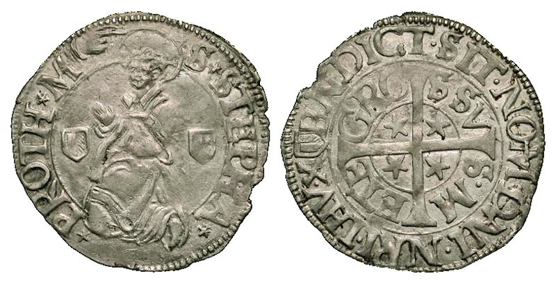 FRANCE, Metz. XIV-XVI Century AD. AR Gros (2.77 gm). Saint Stephen kneeling between shields, Manus Dei above / Gros Tournois-style cross with stars in angles. R.8932. B.1660v. Toned VF+.