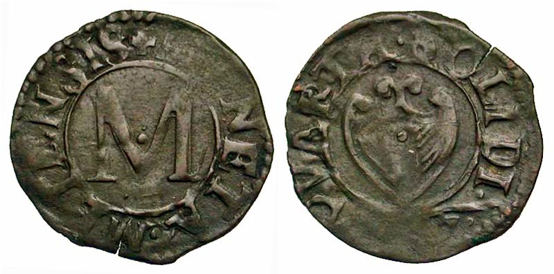 FRANCE, Metz. Civic coinage, XV-XVI Century AD. AR Liard (0.59 gm), 1647. Large M / Shield of arms. Rob.8688. Toned VF.