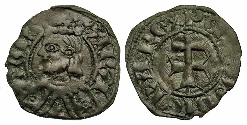 SPAIN. Kingdom of ARAGON. Pedro III de Aragon, 1336-1387 AD. Billon Dinero (0.81 gm) of Zaragoza. Crowned bust / Double barred cross Crus.463. Toned VF+. Scarce