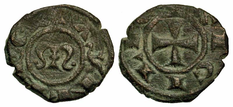 ITALY, Sicily. Manfred, 1258-1266 AD. Billon Denaro (1.02 gm). Large M / Long cross. Sp.206. MEC.613. MIR.140. VF, green patina.