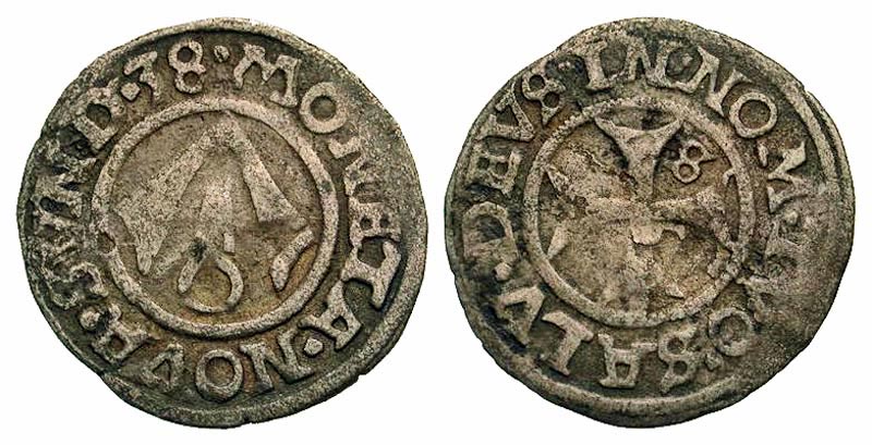 GERMANY, Stralsund. XV Century AD. AR Schilling (0.88 gm), 1538. Arrow-head / Cross with S in one angle. Saurm.4999. Toned Fine+.