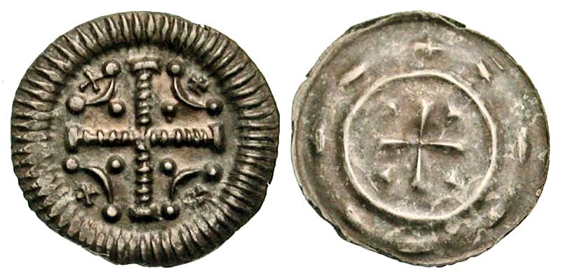 HUNGARY. XII Century AD. AR Denar (0.40 gm). Cross with crescents and pellets / Cross in small circle. Husz.92. Toned XF.