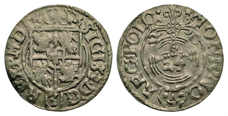 POLAND. Sigismund III Vasa, 1587-1632 AD. AR Three Polker (0.96 gm), (16)20. Shield of arms / Reichsapfel. Gum.970. Toned uneven VF+.