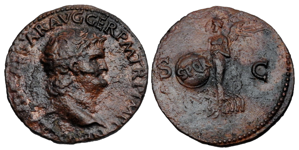 NERO, 54-68 AD. Æ As (9.85 gm), 65 AD. Laureate head / Victory flying with shield inscribed SPQR. RIC.314(S). VF, brown patina, some porosity. Great reverse.