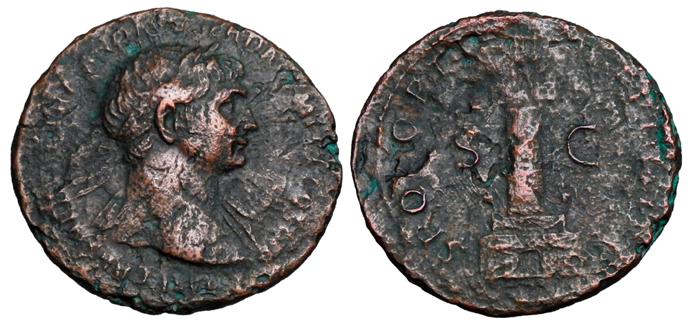 TRAJAN, 98-117 AD. Æ As (8.88 gm). Rome, 112-117 AD. Laureate bust, slight drapery / Trajans column. RIC.600. Fine+, brown patina. Scarce and popular.