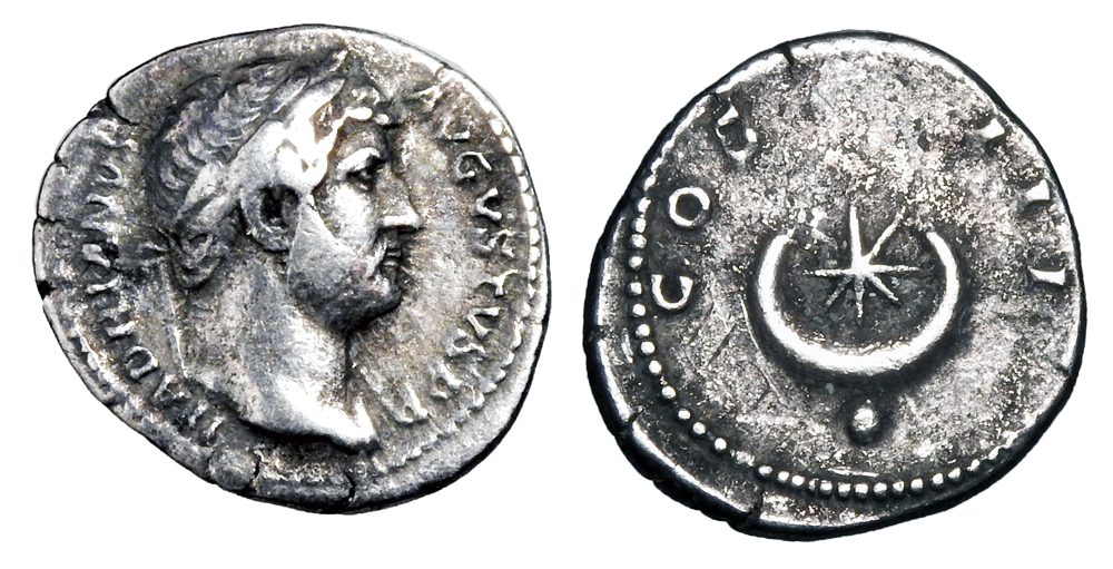HADRIAN, 117-138 AD. AR Denarius (3.12 gm). Laureate head / Star and crescent representing eclipse. RIC.201. Toned aVF.