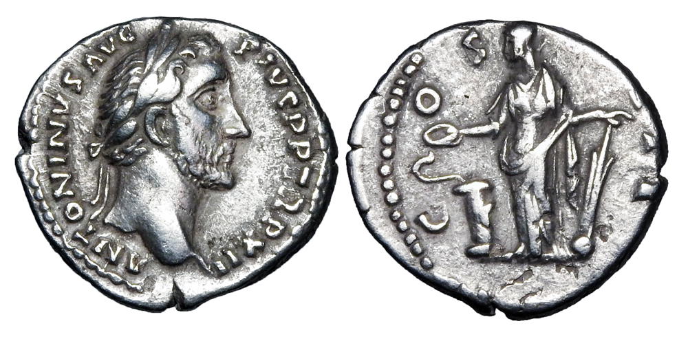 ANTONINUS PIUS, 138-161 AD. AR Denarius (3.46 gm), 148-9. Laureate head / Salus standing holding patera and rudder, feeding snake over altar. RIC.181. VF+.