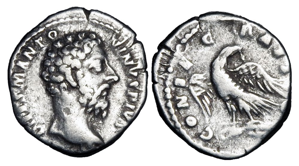 MARCUS AURELIUS, 161-180 AD. AR Denarius (2.84 gm), posthumous commemorative. Bare head / Eagle standing on thunderbolt. RIC.270. Toned VF.