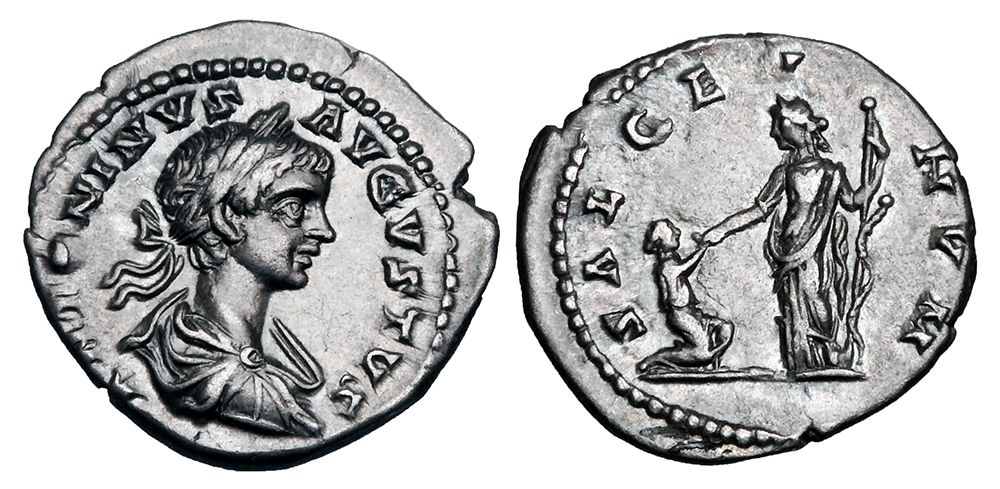 CARACALLA, 198-217 AD. AR Denarius (3.31 gm), 201 AD. Laureate youthful draped bust / Salus standing raising kneeling figure, holding serpent wreathed scepter. RIC.42. Toned aXF. ex Aldred collection.