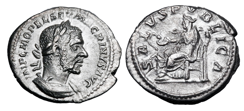 MACRINUS, 217-218 AD. AR Denarius (3.28 gm) of Rome. Laureate cuirassed bust / Salus seated feeding serpent from patera. RSC.114. RIC.86. Toned aXF.