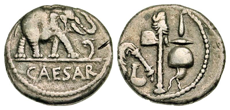 JULIUS CAESAR, died March 15, 44 BC. AR Denarius (3.61 gm). Elephant trampling serpent / Pontifical implements. Cr.443/1. RSC.49. Toned VF+