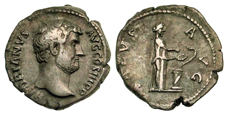 HADRIAN, 117-138 AD. AR Denarius (3.02 gm). Bare head / Salus standing feeding serpent. RSC.1335. RIC.267. Toned VF.