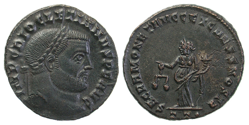 Diocletian. A.D. 284-305. Æ Follis (26.2 mm, 10.05 g, 5 h). Ticinum, A.D. 300-303. IMP C DIOCLETIANVS P F AVG, laureate head right / SACRA MONET AVGG ET CAESS NOSTR, Moneta standing left, holding scales and cornucopia; TT· in exergue. RIC 43a. EF.