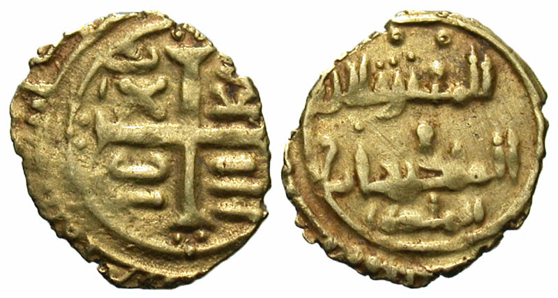 Italy, Norman Sicily. Roger II. 1105-1154. AV tari (12.0 mm, 0.67 g, 12 h). Siqilliya mint, second series, struck 1130-1140. Arabic legend reading 'al-malik Rujar al-mu'tazz billah' / IC/XC NI/KA in two lines across field flanking central cross pattee; mint and date in outer margin. Spahr 59; Biaggi 1231. VF.