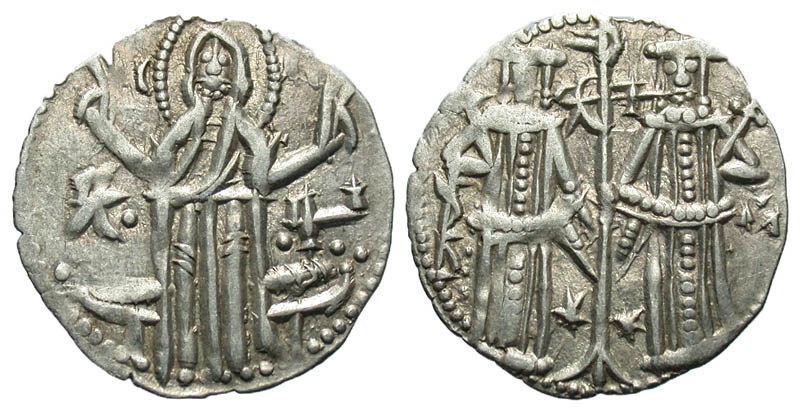 Bulgaria, 2nd Empire. Ivan Aleksander. 1331-1371. AR grosh (21.1 mm, 1.62 g, 6 h). Christ standing facing before seat, raising hands in benediction; IC XC and monograms across field / Ivan Aleksandar and Mihail Asen IV standing facing, each holding cross-tipped scepter, holding Christogram-tipped staff between them; monograms across field; stars flanking base of staff. R&Z 1.13.5. gVF.